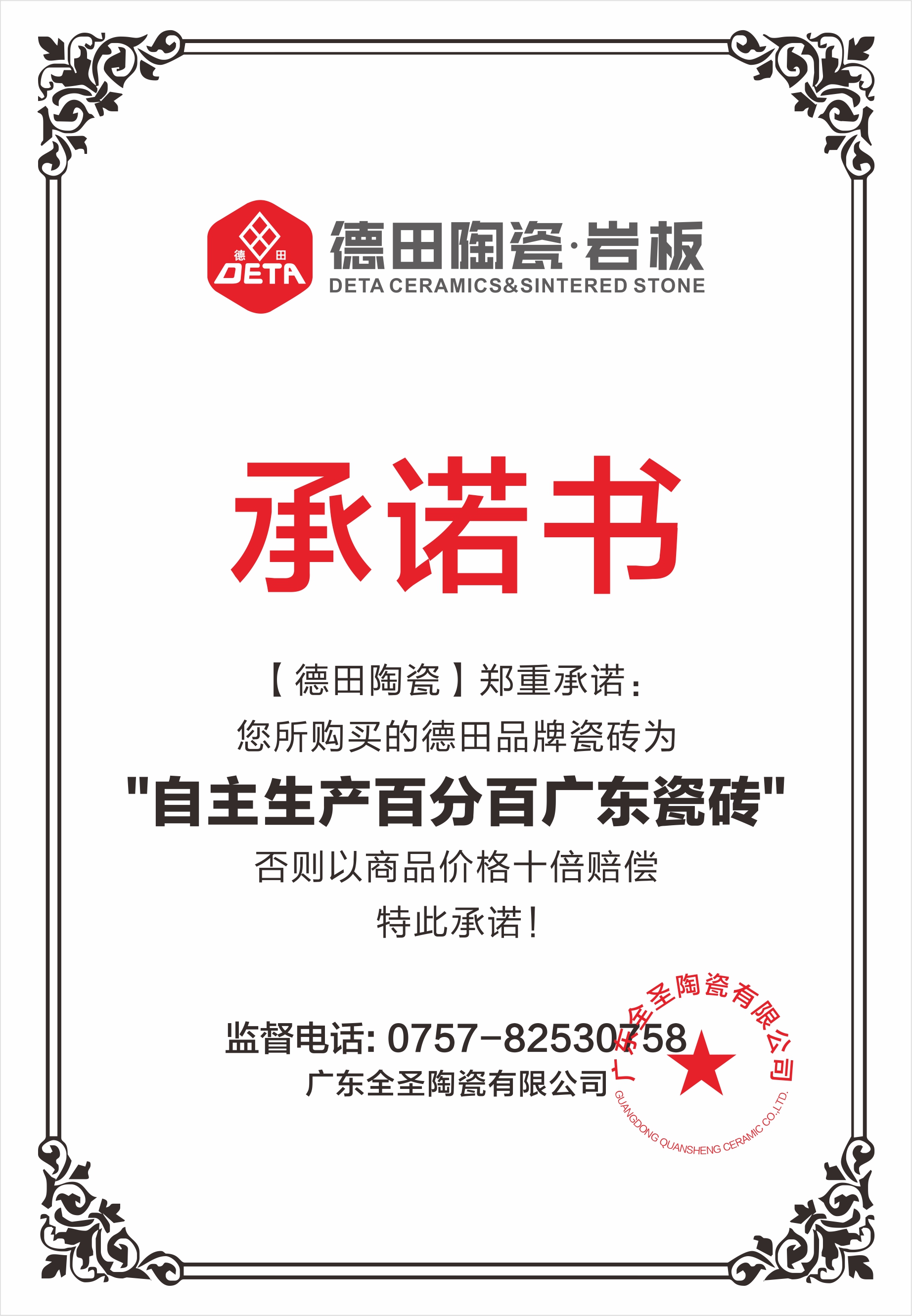 德田陶瓷始建于1998年,是全圣集團旗下的品牌之一,在廣東擁有兩個大型現代化環保型生產基地,分別位于廣東恩平市、廣東肇慶市。憑借企業雄厚的研發、生產及品牌運營實力,德田陶瓷已建立了豐富的產品體系:產品涵蓋了巖板、通體大理石瓷磚、瓷拋磚、大板瓷磚、中板瓷磚、自由連紋大理石瓷磚、花崗巖瓷磚、瓷片等品類;更涵蓋了 400X800mm、600X600mm、800X800mm、600X1200mm、750X1500mm、900X1800mm、800X2600mm、1200X2400mm等規格,產品花色豐富,品質穩定。